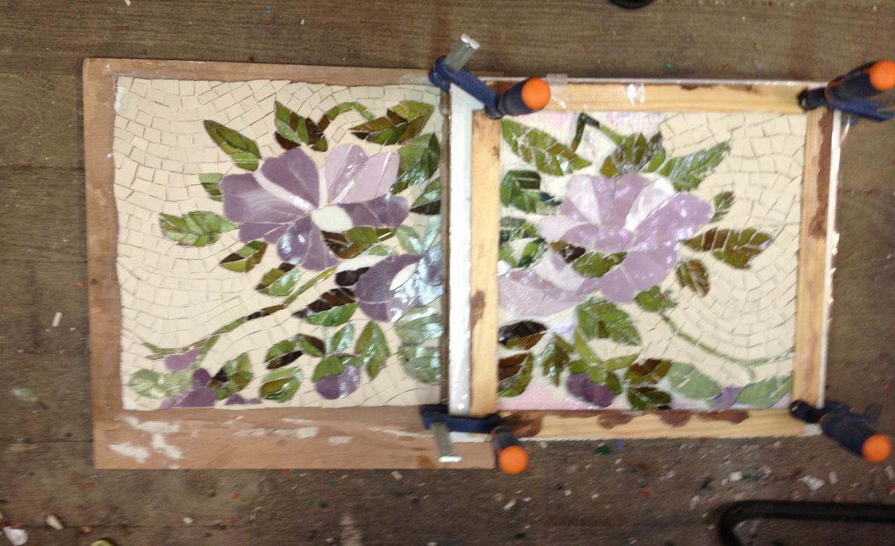 Double panneau réalisé avec de la pâte de verre "Albertini" et du grès Cérame, en vue d'être installé sur un mur extérieur.